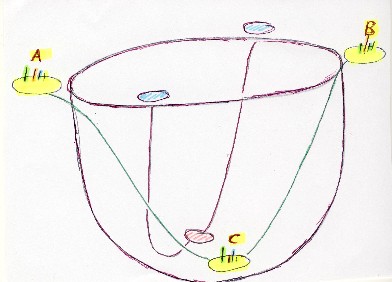 Was die Kampftauglichkeit angeht, habe ich hingegen eine Reihe an Varianten, welche Kampftauglichkeit begünstigen und viele Varianten, die sie reduzieren. Am oberen Rand der nachfolgend abgebildeten "Suppenschüssel" sind die günstigen Profile dargestellt, in Bodennähe der Schüssel die ungünstigen Profile. Profil A könnte eine ziemlich starke Person mit eher geringem technischen Vermögen repräsentieren, Profil B eine sehr schnelle, koordinierte und technisch versierte Person von eher geringerer Körperkraft. Bei Profil C können entweder niedrige Leistungsparameter vorhanden sein oder aber relativ hohe Leistungsparameter, mit einer nur geringen gemeinsamen Verfügbarkeit im Rahmen koordinierter Bewegungsabläufe (die Koppelung zwischen motorischen Fähigkeiten und einer ihnen entsprechenden sinnvollen technischen Umsetzung ist sehr gering).