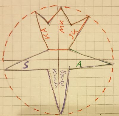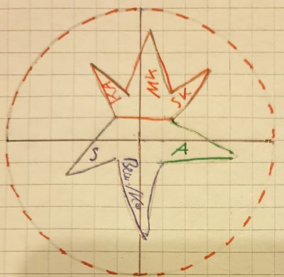 Abbildung unten: Bei einem Boxer wirken die verschiedenen Fähigkeiten sehr gut zusammen! Deshalb sind die Stäbe dicht aneinander stehend und insbesondere dicht ans Zentrum gezeichnet (der schwarze Stab in der Mitte steht für die technischen Fähigkeiten) . Beim Bildbeispiel des Bodybuilders ist sehr viel Kraft vorhanden (roter Stab), die Menge an technischen Fähigkeiten ist gering (=kürzerer schwarzer Stab), die Ausdauer ist vergleichsweise gering (blaugrüner Stab) und könnte nur schwerlich in kampfspezifische Bewegungsabläufe einfließen (=relativ hohe räumliche Distanz des blaugrünen Stabes zum Zentrum).